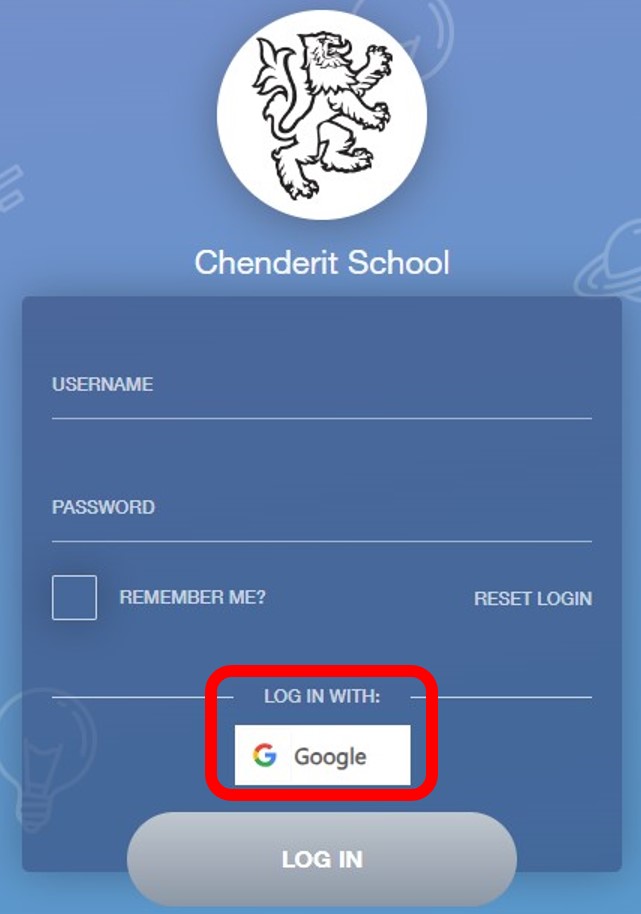 On the following screen, click the 'Login in with Google' icon as shown below (do not type in your username or password) and choose your school Google account that ends with Chenderit.net: