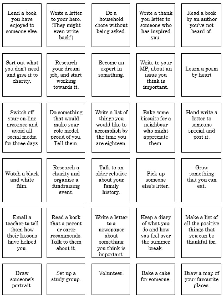 This year, our Summer Assignment is designed not only to help you develop your skills, but also to make you feel good! Some of the challenges even help make the world a better place. We want you to complete as many of the challenges below as possible: